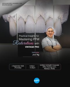 Date: 3 September 2025 Time: 9am Venue: Xenial Restaurant Ball Room,Level-2, Dhanmondi-27, Dhaka Date: 5 September 2025 Time: 10am Venue: Well Park Meeting Room, OR Nizam Road, Chittagong   Synopsis:  Porcelain fused to metal (PFM) restorations have a long track record and are still routinely prescribed due to  their reliability, longevity and cost benefits to […]